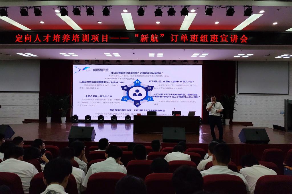 最后,浙江新一海海运有限公司周勇船长,向同学们介绍了学校与该公司的产教融合成果——教育部定向人才培养培训项目(“市域产教联合体‘百千服务行动’背景下航海类人才培养实践”)。周勇船长还就“新航”订单班组班进行了宣讲。