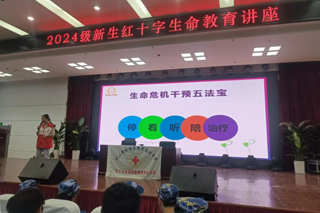 校红十字会秘书长金曙敏老师为新生讲授了《珍爱生命守门人》专题健康教育讲座,她以“生命守门人”为核心,从守什么门?怎么守?等方面,通过互动交流、现场提问等方式,生动形象地为学生们呈现了如何危机干预停、看、听、陪、治疗五法宝发现及帮助危机个案。