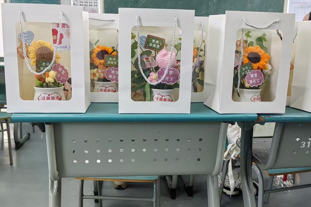 教室里,港贸学生们亲手制作了各种DIY鲜花摆饰以及“桃李满天下,恩情似深海”的贺卡,送到每位老师手中,让老师们倍感温暖。