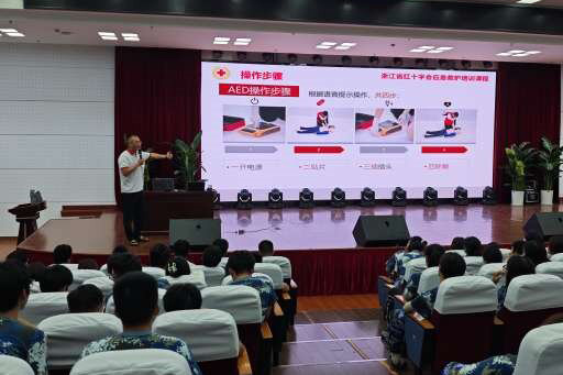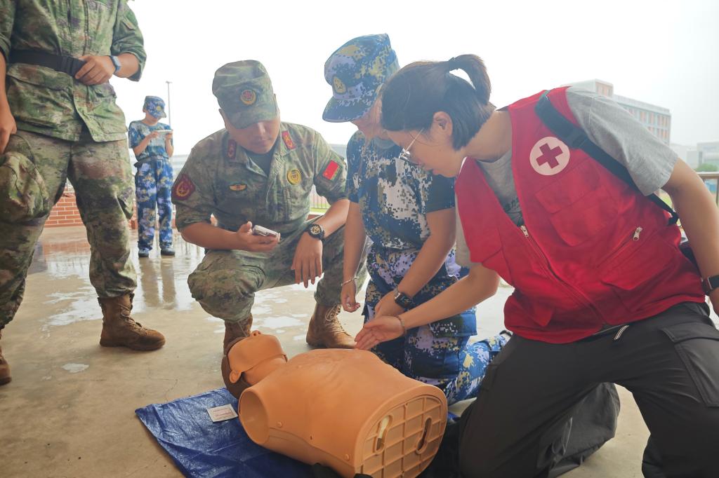 军训期间,多部门联合为2500余名新生开展急救教育普及活动,校红十会秘书长金曙敏开展了红十字生命教育讲座;救护师资孙磊、翁来勇、孙丹晔等三位老师,分别开展了心肺复苏+AED操作、海姆立克急救法等内容丰富的应急救护普及培训。