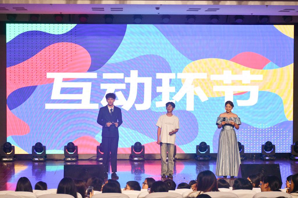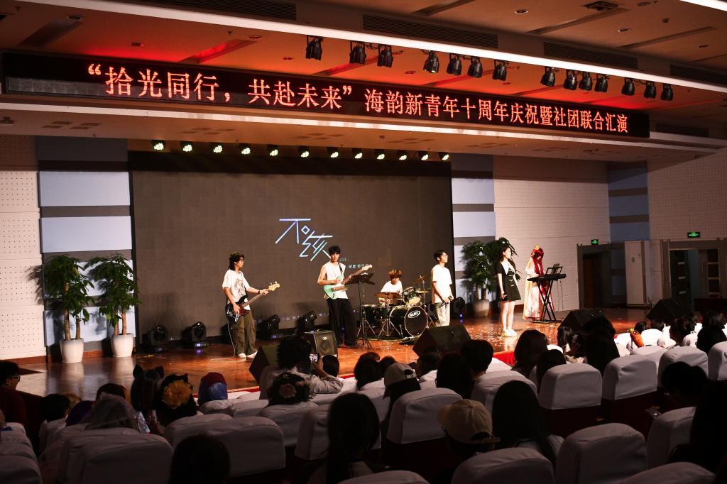 参与联合汇演的各社团以乐队演奏、独唱、街舞表演、汉服走秀等形式为在场观众带来了一场视听盛宴。围绕“海韵新青年”“海小豚”志愿者等校园品牌活动展开的问答互动环节则带来一波氛围高潮。