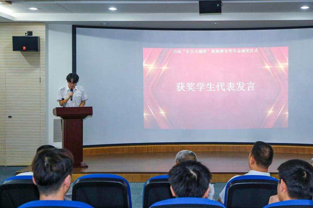 2023级航海技术5班罗云鹏作为获奖代表上台发言。他深情回顾了加入“长昌卓越班”以来的成长历程,从他质朴的话语中,充满了对母校与企业的拳拳感恩之心。