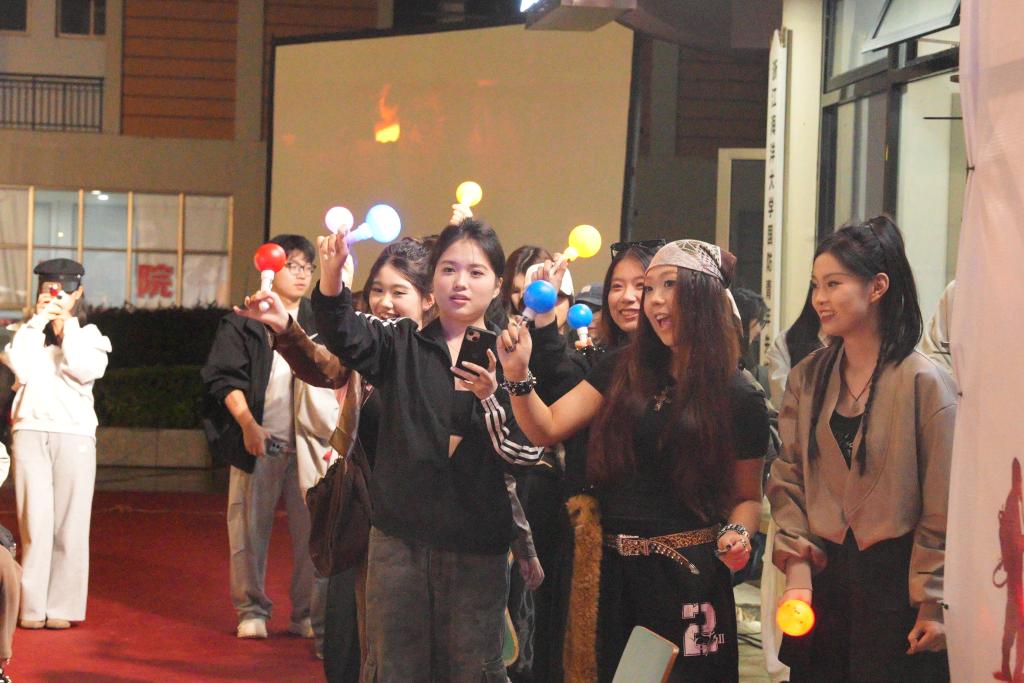 我校近40名社团成员参与了此次活动。在“星光大道”环节,动漫社的coser盛装亮相,自信走秀,展现出对电影艺术的热忱;在舞台展演中,弦心社带来的乐队演出《鲜花》《我的美丽》,街舞社的舞蹈表演 《take the lead》技惊四座,赢得现场阵阵欢呼与掌声,尽显我校学子风采。