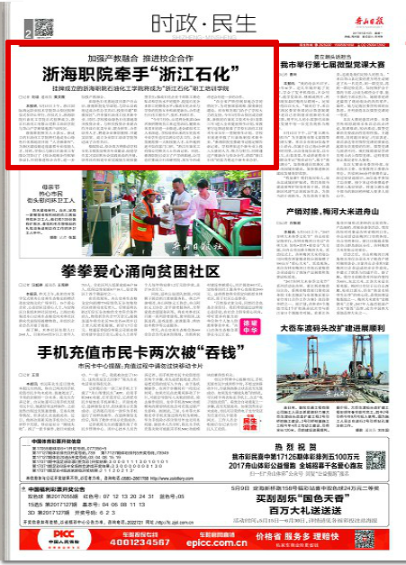 浙海职院相关人士表示,新成立的石油化工学院将打造成舟山绿色石化基地项目的“人才储备库”,为新区建设输送高素质专业技能人才。同时,学校已与浙江石油化工有限公司签订了《校企战略合作框架协议》,共同推进校企合作,进一步加强产教融合。