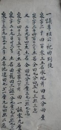 高家分关书还专门辟出“尊先祖祭祀田亩”一项,其中在牛栏丘、路下槌、三分塘里共有祭祀田约九亩三分八厘,以保证今后家族祭祀之用。