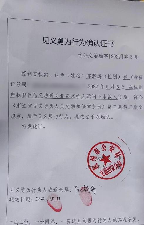 事发当天下午1时许,正在杭州市水上巴士公司实习的陈瀚涛听到呼喊“有人落水了!”来不及细想,陈瀚涛立刻飞奔过去,发现有一位妇女,双手挥动着,正在水中浮浮沉沉……