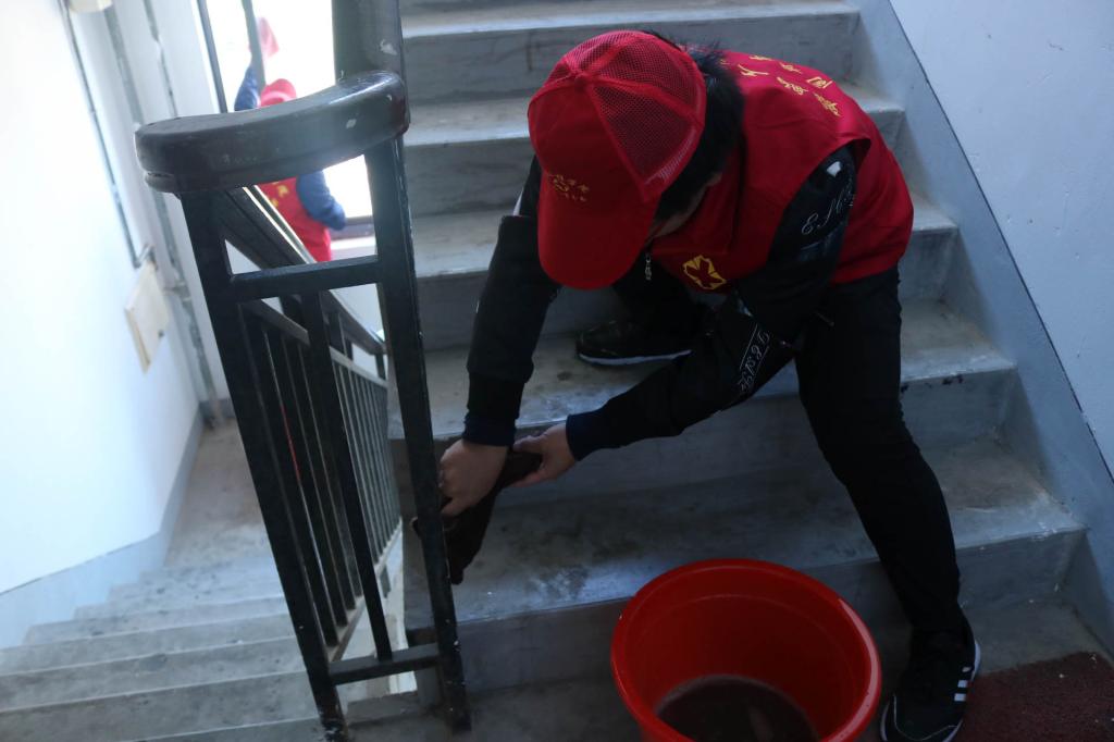根据事前分组,大家领取工具后,就迅速分散到社区的各个角落,开始清理工作。上午,志愿者们和市红十字博爱之家的老师们一起对小区的多层住宅楼楼道扶手及小广告进行了清理;下午在船舶工程学院老师的带领下对社区绿化带的烟头和白色垃圾进行了清理。志愿者们挽起袖子,拎上水桶,拿着抹布,仔细地擦除铁门、牛奶箱和报箱的污物和小广告,将楼道的玻璃、扶手擦拭得干干净净,小区环境明显变得更加整洁、有序。(图文/林芷伊)
