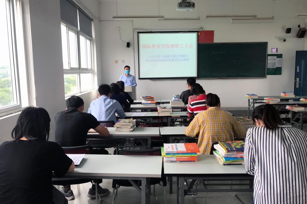 为进一步贯彻落实学校创建全国文明城市和省级文明校园决战动员会精神,5月28日下午,国际教育学院在1406教室召开教职工大会,动员部署创建全国文明城市和省级文明校园工作。会议由国际教育学院党支部书记黄承主持。