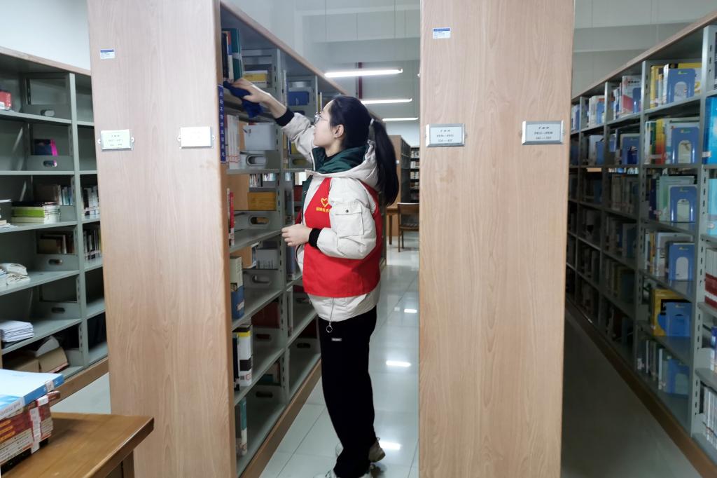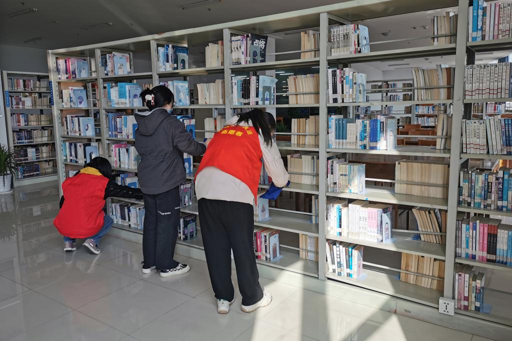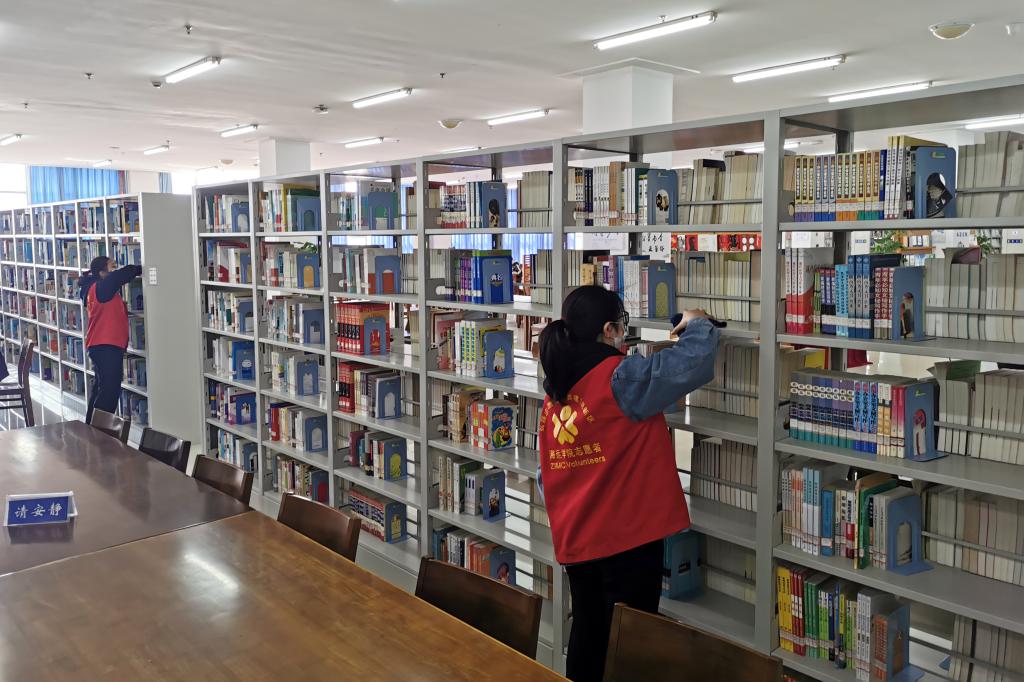在图书馆工作人员的带领下,志愿者们有序进入了图书馆二楼、三楼书库,开始在书库不同区域分工合作。他们穿梭于一排排书架之间,有条不紊地把散放图书按不同类别进行排序、归位。志愿者们还认真清理书架上的灰尘,仔细地打扫每一个角落,安静又高效地完成了工作,使图书馆变得干净又整洁。