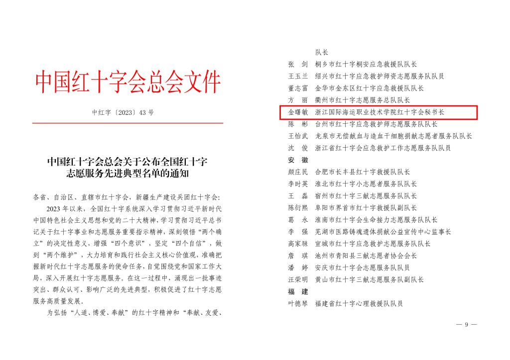 近日,中国红十字总会公布全国红十字志愿服务先进典型名单。我校红十字会秘书长金曙敏荣获“全国红十字志愿服务先进典型”荣誉称号,也是全省高校仅有的2名优秀志愿者之一。