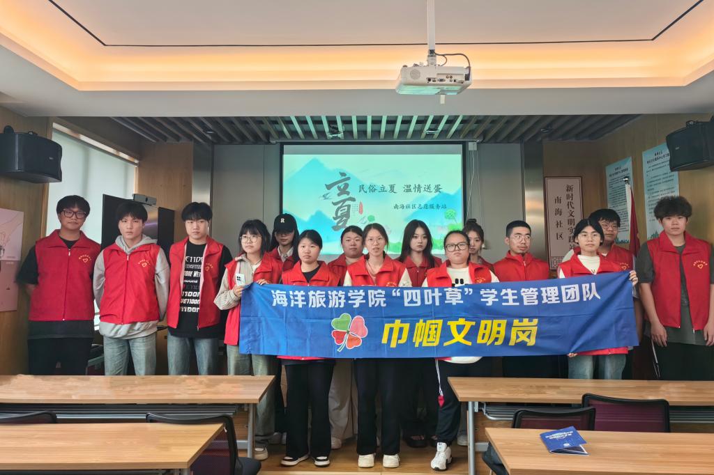 立夏这天,海洋旅游学院学生志愿者服务团队的“小叶子”们助力南海社区开展“温情送蛋”活动,为社区居民送节气祝福。