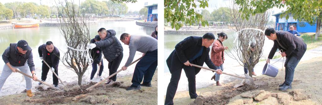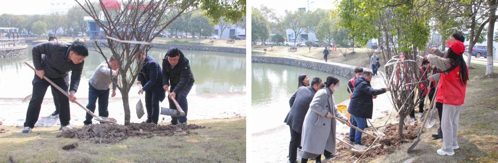 活动现场,大家分工协作、干劲十足,挥锹培土,合力栽下梅树,铲土、培土、浇水……校园湖边奏响“春之序曲”。