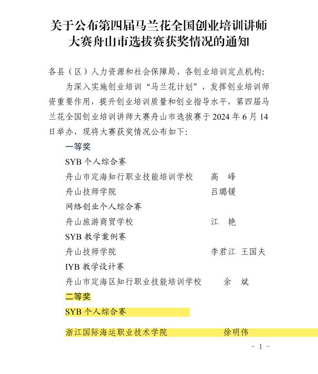 6月,在第四届马兰花全国创业培训讲师大赛舟山市选拔赛中,由致远创业选送的创业培训导师——徐明伟,获得了SYB个人综合赛二等奖。