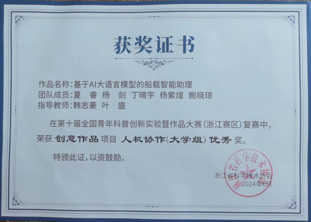 6月份,组织师生团队备赛由浙江省科学技术协会举办的“第十届全国青年科普创新实验暨作品大赛(浙江赛区)”——大学组人机协作赛道比赛,共有12个作品入围全省复赛,我校代表队是入围全省复赛的三所高职院校之一,最终我校代表队参赛的《基于AI大语言模型的船载智能助理》获得了“第十届全国青年科普创新实验暨作品大赛(浙江赛区)创意作品项目人机协作(大学组)优秀奖,排在高职院校第二名。