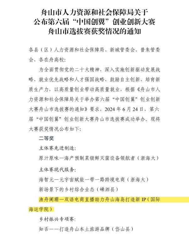 致远创业学院组织学生创业团队参加舟山市第六届“中国创翼”创业创新大赛,由我校选送的“渔舟阑珊—双语电商直播助力舟山海岛打造新IP”项目脱颖而出,荣获“主体赛现代服务”赛道的二等奖。